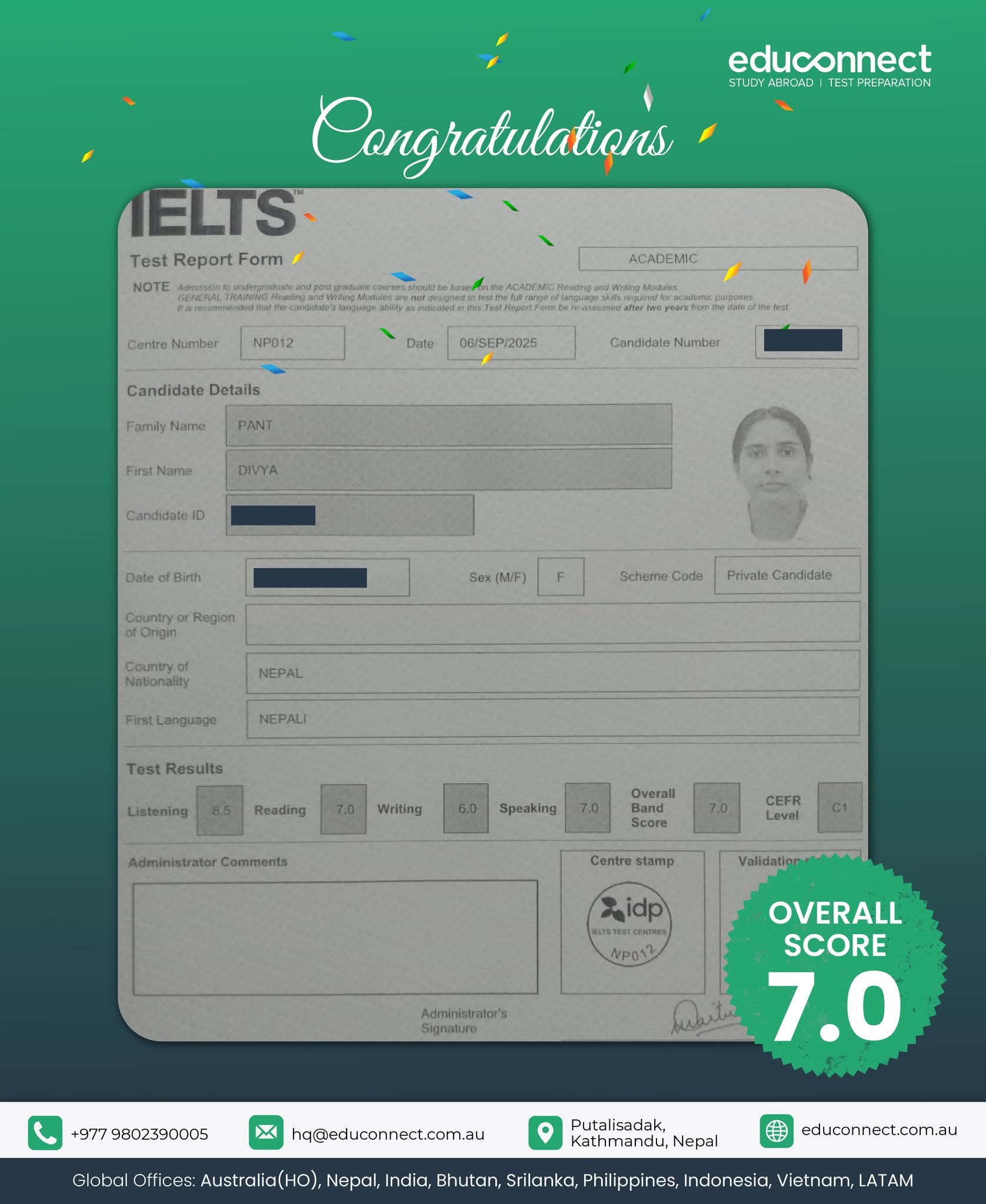 At EduConnect, every student’s achievement is a proud moment. Recently, several students successfully received their visas, marking a significant milestone in their academic journey abroad. This accomplishment reflects their dedication, hard work, and determination to pursue global opportunities. The occasion also highlights our ongoing commitment to guiding students through each step of the study-abroad process. We are excited to see them embark on this new chapter and achieve great success in their chosen destinations. Achieving such a high score opens doors to countless academic and career opportunities, and we hope this success story inspires other students to aim high and stay committed to their goals. Congratulations on this fantastic milestone, we can’t wait to see what you achieve next!
