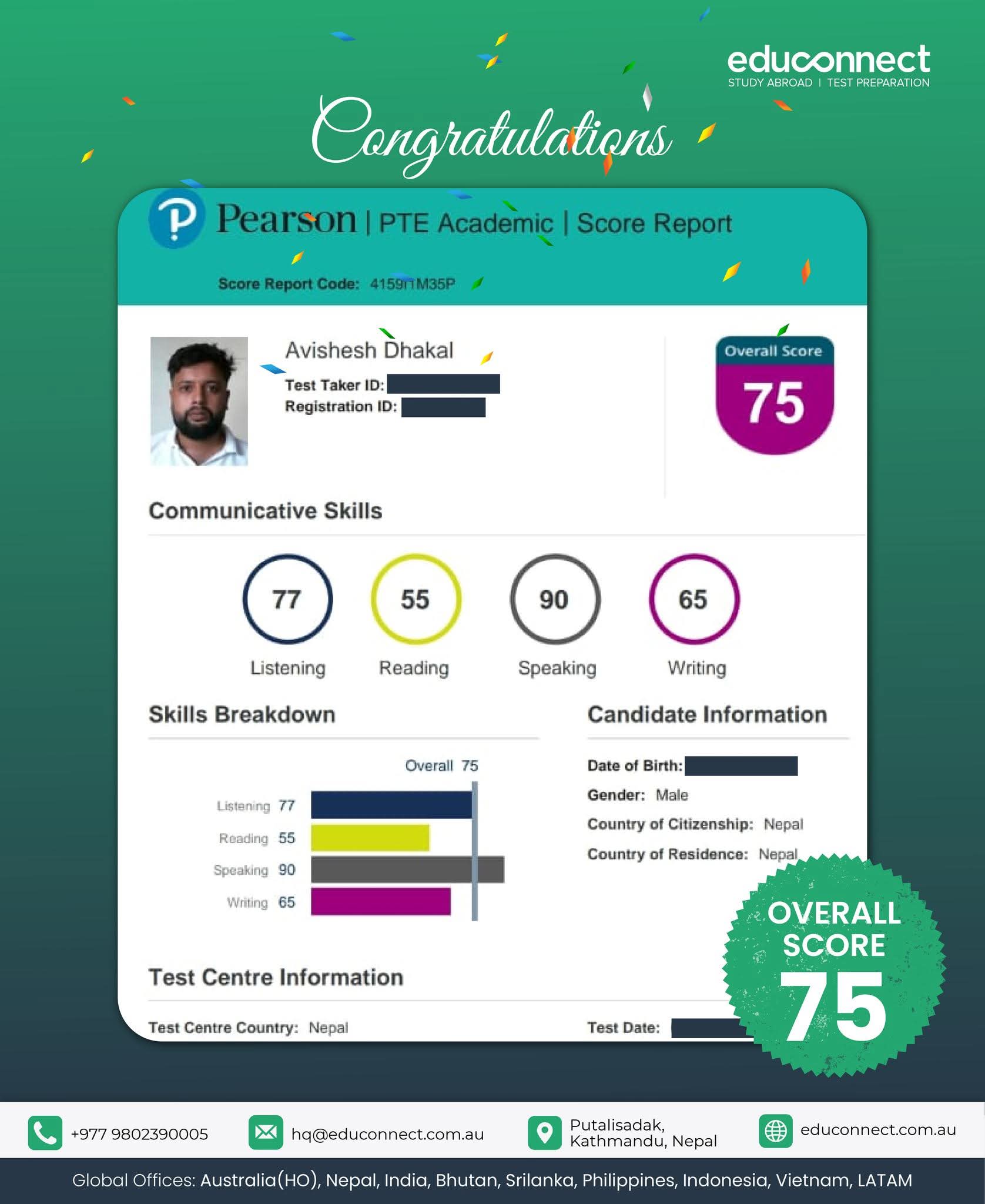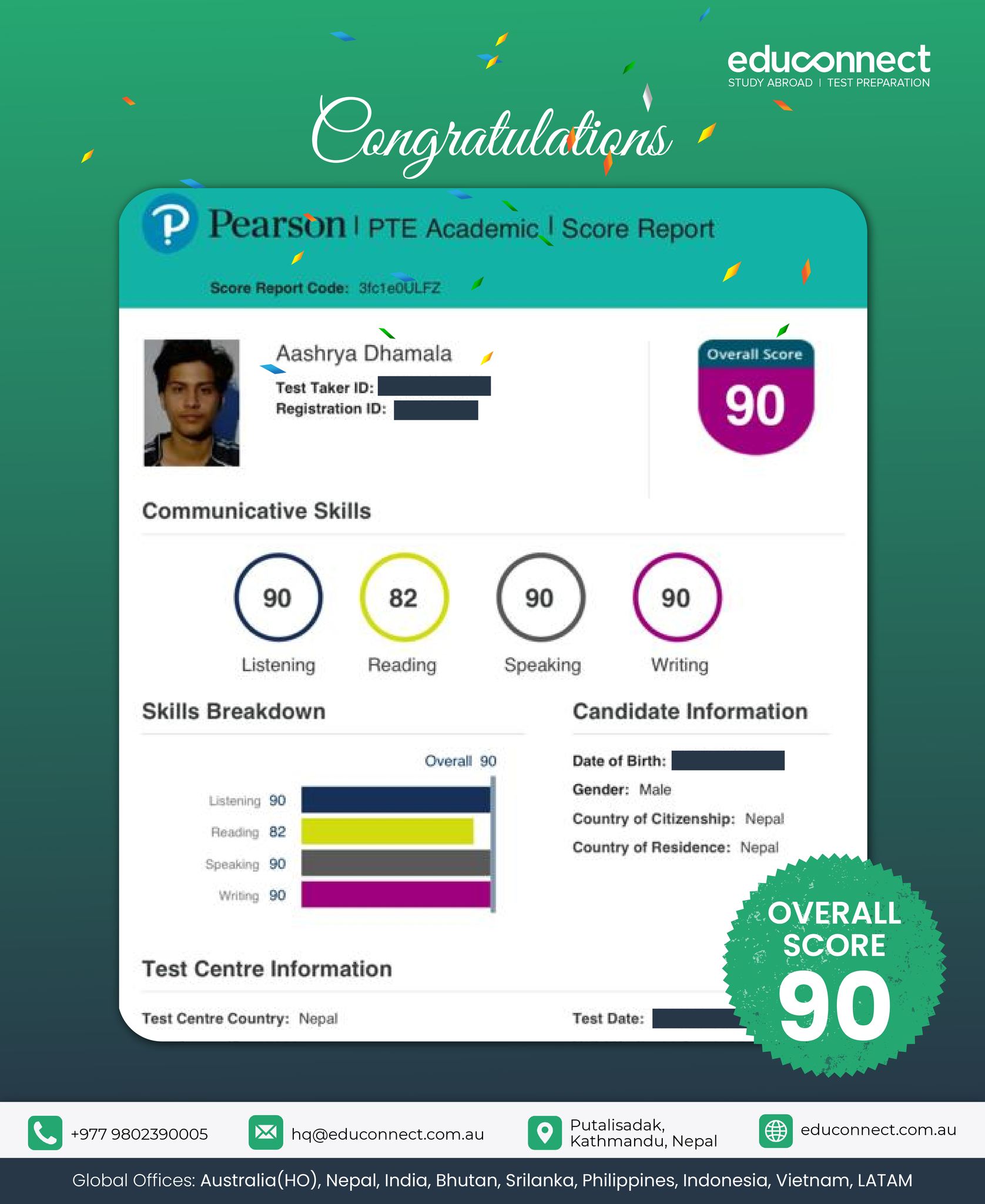 We are incredibly proud to celebrate the remarkable achievement of one of our students who recently scored an impressive 90 in the PTE (Pearson Test of English). This outstanding result reflects not only their dedication and hard work but also the support and guidance provided by our Educonnect team throughout their preparation journey.